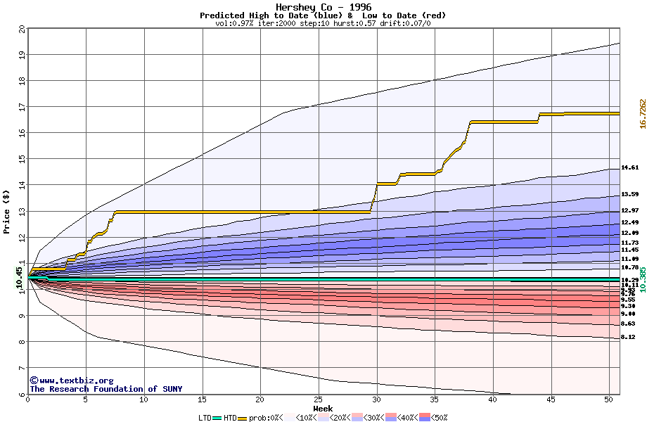 The high to date and low to date prices of the stock plotted against a random walk model for 1996 (what's this?).