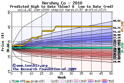 The high to date and low to date prices of the stock plotted against a random walk model for 2010 (what's this?).
