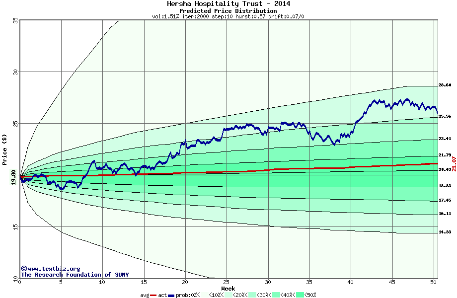 The following graph plots the year-to-date performance of the stock for 2014 compared to the probability calculated by a random walk model.