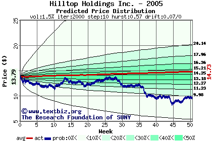 The high to date and low to date prices of the stock plotted against a random walk model for 2005 (what's this?).