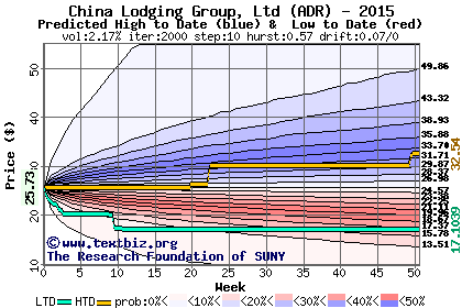 The high to date and low to date prices of the stock plotted against a random walk model for 2015 (what's this?).