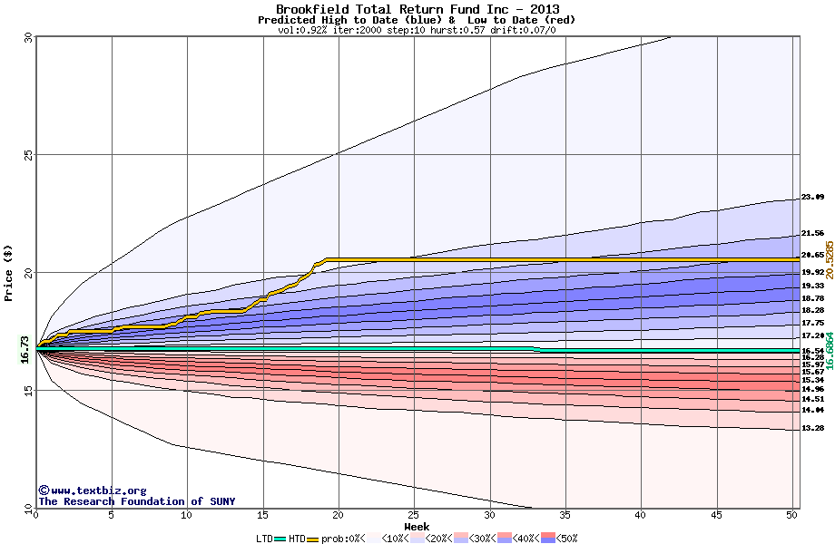 The high to date and low to date prices of the stock plotted against a random walk model for 2013 (what's this?).