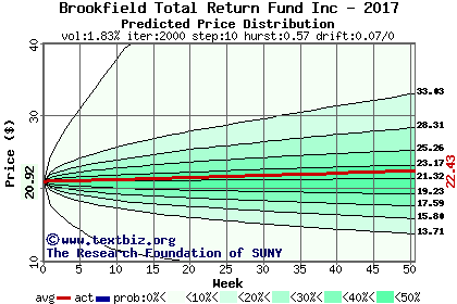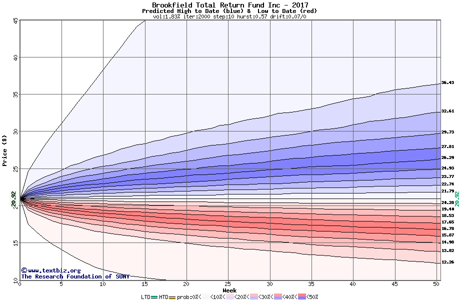 The high to date and low to date prices of the stock plotted against a random walk model for 2017 (what's this?).
