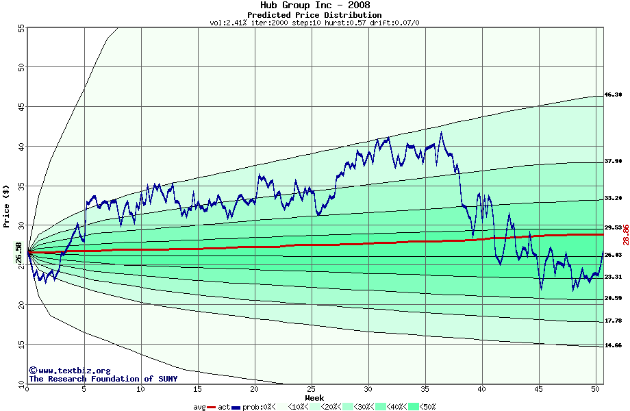 The following graph plots the year-to-date performance of the stock for 2008 compared to the probability calculated by a random walk model.