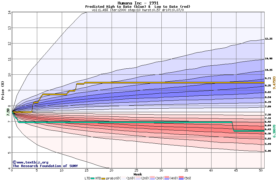 The high to date and low to date prices of the stock plotted against a random walk model for 1991 (what's this?).
