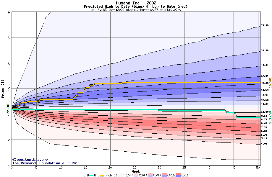 The high to date and low to date prices of the stock plotted against a random walk model for 2002 (what's this?).