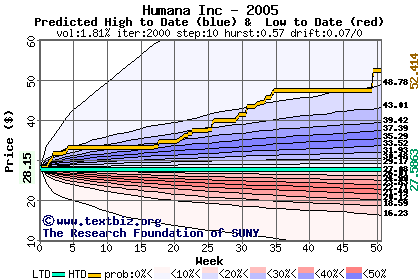 The high to date and low to date prices of the stock plotted against a random walk model for 2005 (what's this?).