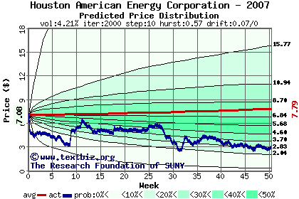 The high to date and low to date prices of the stock plotted against a random walk model for 2007 (what's this?).