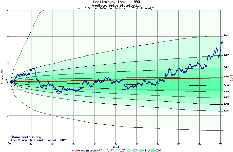 The following graph plots the year-to-date performance of the stock for 1993 compared to the probability calculated by a random walk model.