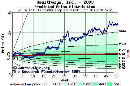 The high to date and low to date prices of the stock plotted against a random walk model for 2003 (what's this?).