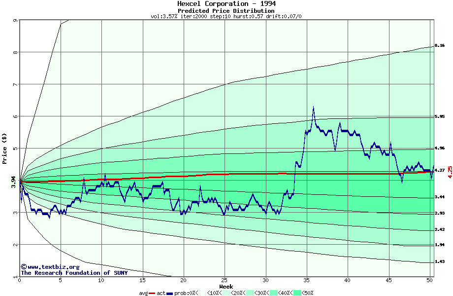 The following graph plots the year-to-date performance of the stock for 1994 compared to the probability calculated by a random walk model.