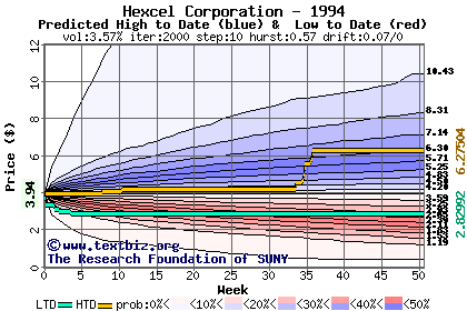 The high to date and low to date prices of the stock plotted against a random walk model for 1994 (what's this?).