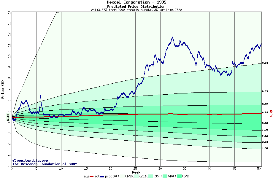 The following graph plots the year-to-date performance of the stock for 1995 compared to the probability calculated by a random walk model.
