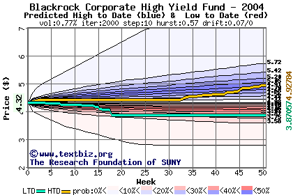 The high to date and low to date prices of the stock plotted against a random walk model for 2004 (what's this?).