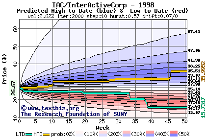 The high to date and low to date prices of the stock plotted against a random walk model for 1998 (what's this?).