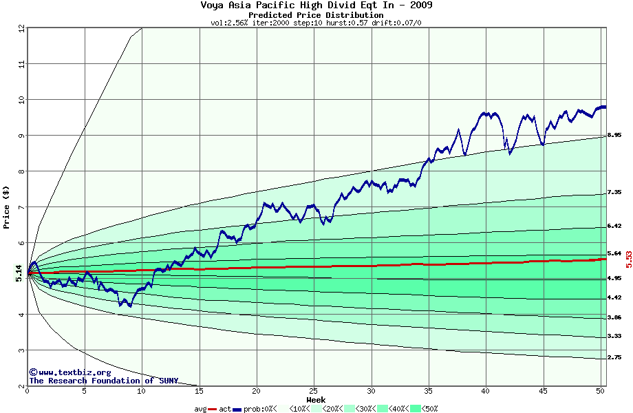 The following graph plots the year-to-date performance of the stock for 2009 compared to the probability calculated by a random walk model.