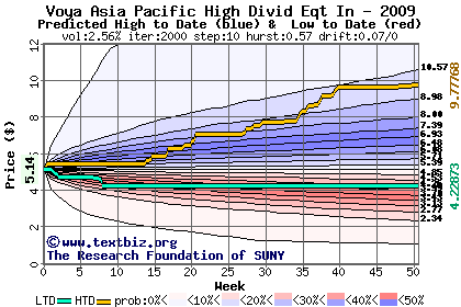 The high to date and low to date prices of the stock plotted against a random walk model for 2009 (what's this?).