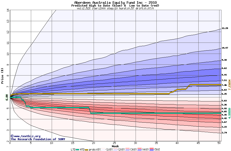 The high to date and low to date prices of the stock plotted against a random walk model for 2010 (what's this?).