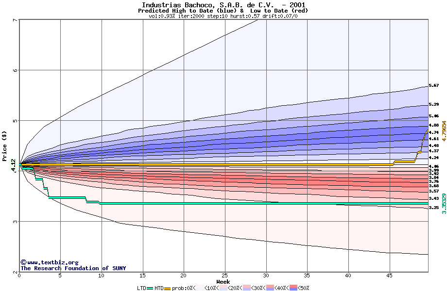 The high to date and low to date prices of the stock plotted against a random walk model for 2001 (what's this?).