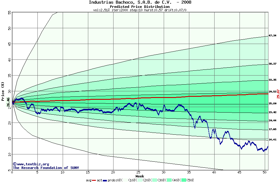 The following graph plots the year-to-date performance of the stock for 2008 compared to the probability calculated by a random walk model.