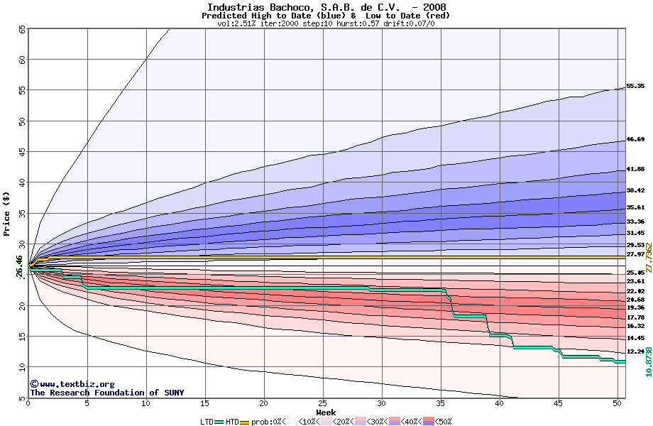 The high to date and low to date prices of the stock plotted against a random walk model for 2008 (what's this?).