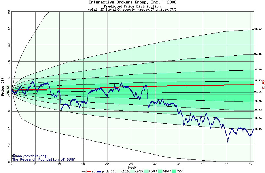 The following graph plots the year-to-date performance of the stock for 2008 compared to the probability calculated by a random walk model.