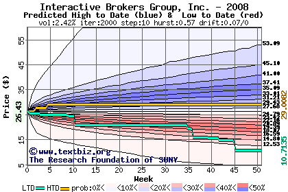 The high to date and low to date prices of the stock plotted against a random walk model for 2008 (what's this?).