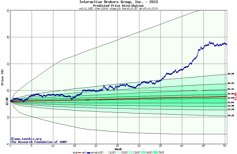The following graph plots the year-to-date performance of the stock for 2013 compared to the probability calculated by a random walk model.