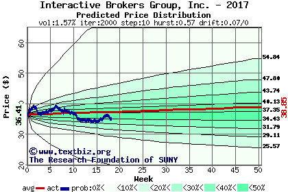 The high to date and low to date prices of the stock plotted against a random walk model for 2017 (what's this?).