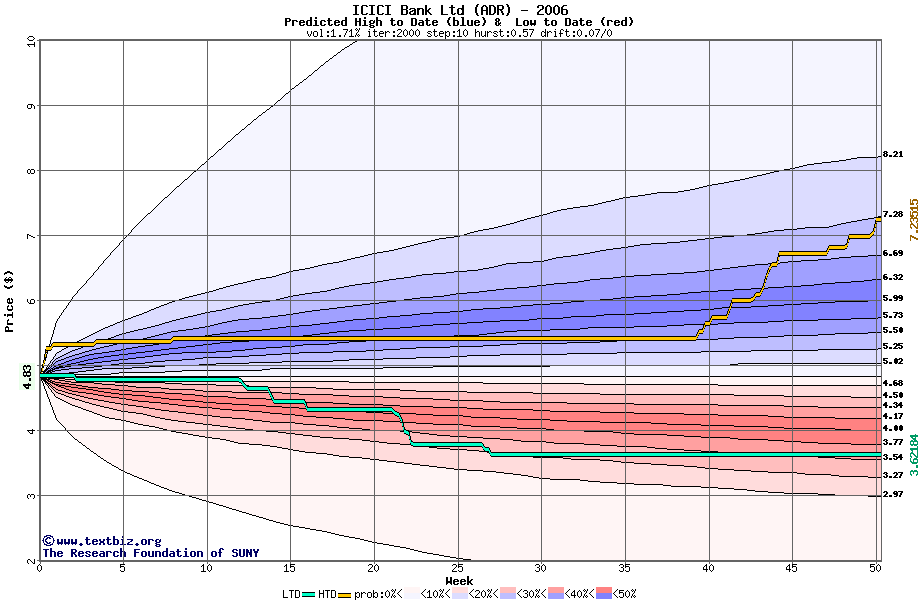 The high to date and low to date prices of the stock plotted against a random walk model for 2006 (what's this?).