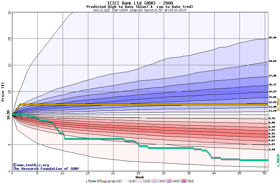 The high to date and low to date prices of the stock plotted against a random walk model for 2008 (what's this?).