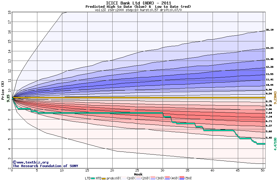 The high to date and low to date prices of the stock plotted against a random walk model for 2011 (what's this?).