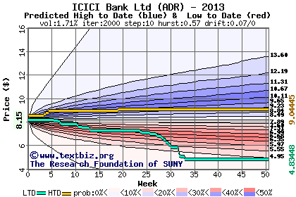 The high to date and low to date prices of the stock plotted against a random walk model for 2013 (what's this?).