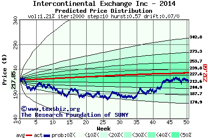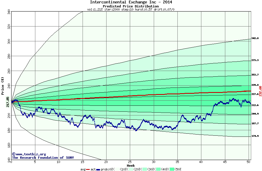 The following graph plots the year-to-date performance of the stock for 2014 compared to the probability calculated by a random walk model.