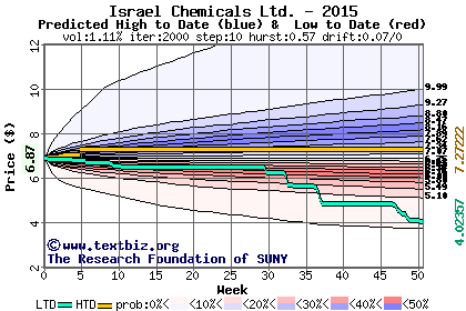 The high to date and low to date prices of the stock plotted against a random walk model for 2015 (what's this?).