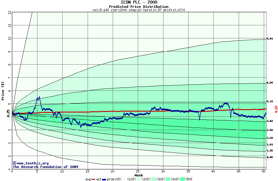 The following graph plots the year-to-date performance of the stock for 2000 compared to the probability calculated by a random walk model.