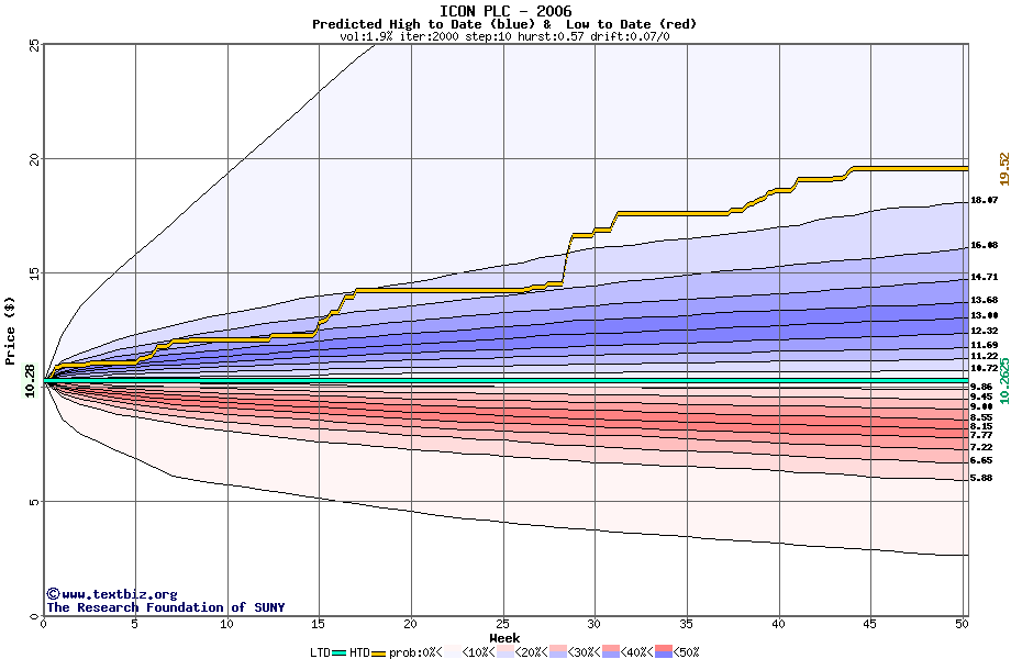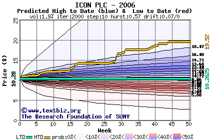 The high to date and low to date prices of the stock plotted against a random walk model for 2006 (what's this?).