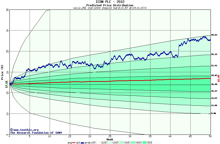 The following graph plots the year-to-date performance of the stock for 2012 compared to the probability calculated by a random walk model.