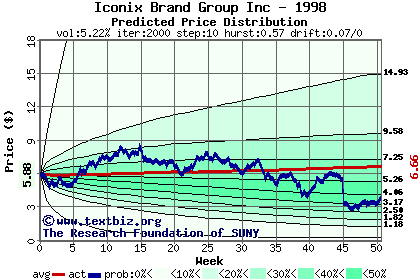 The high to date and low to date prices of the stock plotted against a random walk model for 1998 (what's this?).