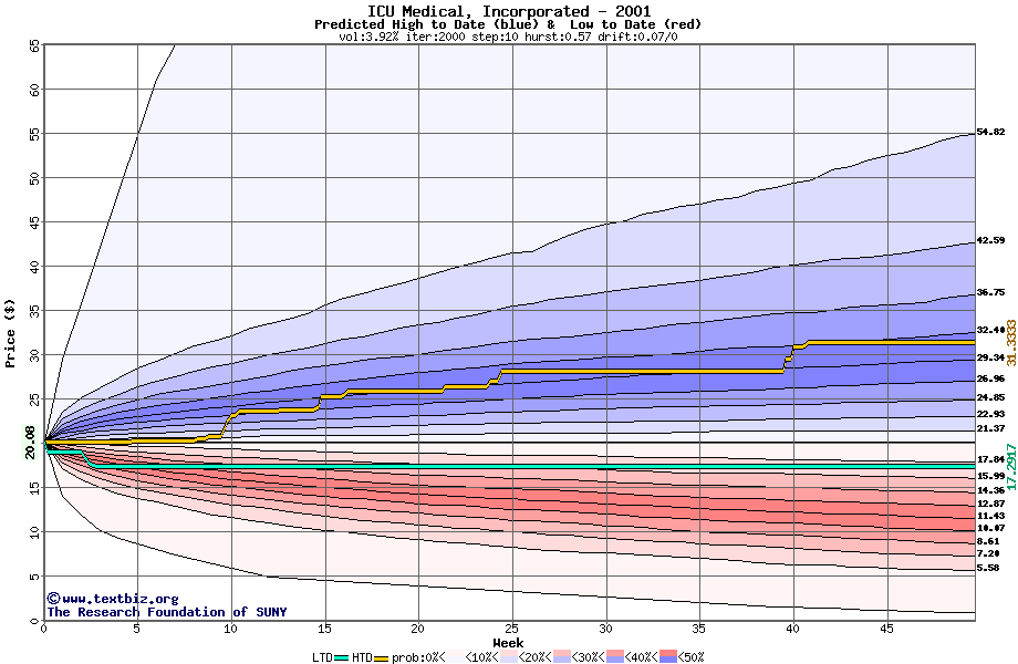 The high to date and low to date prices of the stock plotted against a random walk model for 2001 (what's this?).