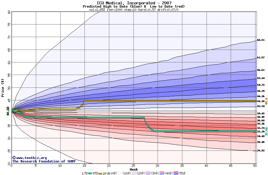 The high to date and low to date prices of the stock plotted against a random walk model for 2007 (what's this?).