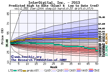 The high to date and low to date prices of the stock plotted against a random walk model for 2013 (what's this?).