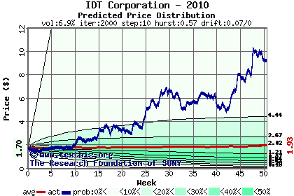The high to date and low to date prices of the stock plotted against a random walk model for 2010 (what's this?).