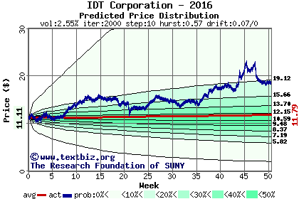 The high to date and low to date prices of the stock plotted against a random walk model for 2016 (what's this?).
