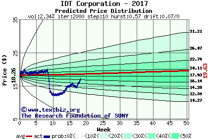 The high to date and low to date prices of the stock plotted against a random walk model for 2017 (what's this?).