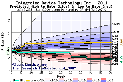 The high to date and low to date prices of the stock plotted against a random walk model for 2011 (what's this?).
