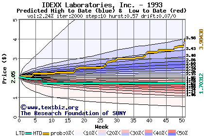 The high to date and low to date prices of the stock plotted against a random walk model for 1993 (what's this?).