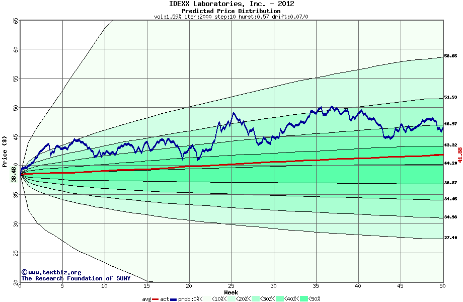 The following graph plots the year-to-date performance of the stock for 2012 compared to the probability calculated by a random walk model.