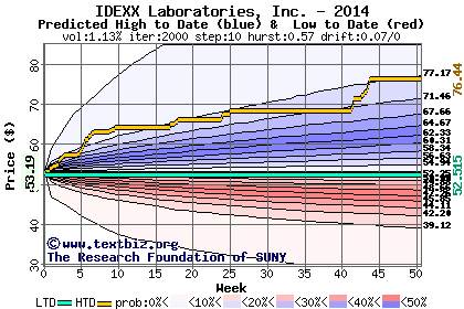 The high to date and low to date prices of the stock plotted against a random walk model for 2014 (what's this?).