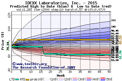 The high to date and low to date prices of the stock plotted against a random walk model for 2015 (what's this?).